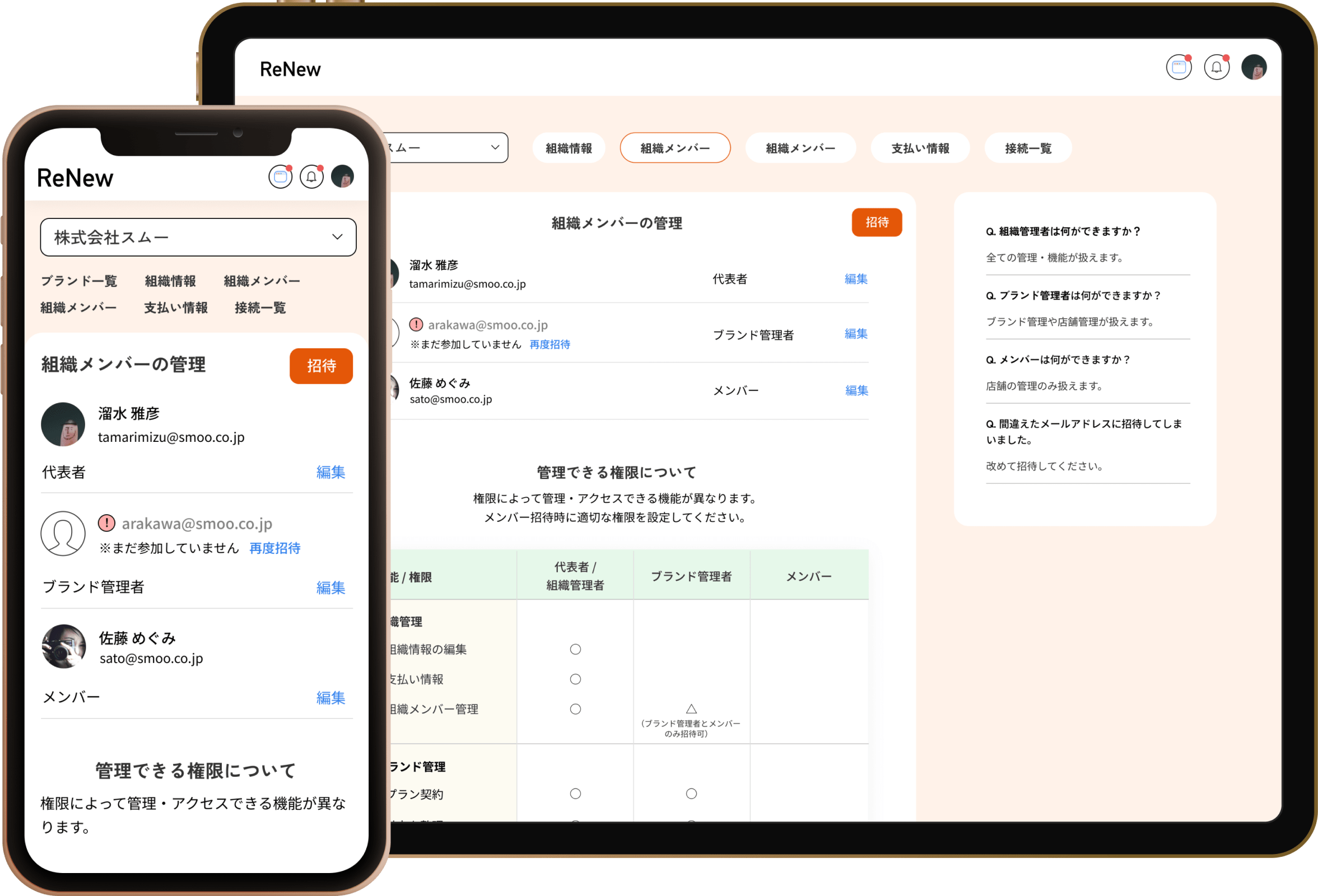メンバーの権限管理も行え、支払い操作ができないメンバー権限など、現場のスタッフも使用しやすい仕組みにアップデートしています。