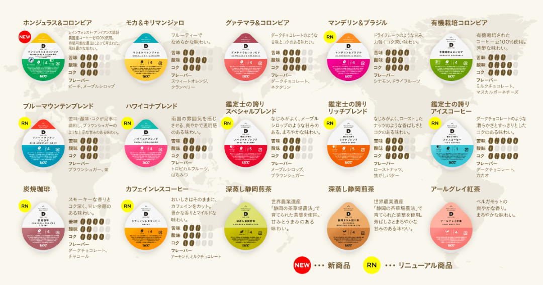 新しいカプセルラインアップでは、定番カプセルラインアップ全15種類のうち8種類がリニューアルし、コーヒー原料やブレンド、ロースト(焙煎)がこれまでと異なる新しい製品となります。さらに、「ホンジュラス&コロンビア」が定番ラインアップに新たに加わります。また、原料の選定においても新製品「ホンジュラス&コロンビア」をはじめとした4製品においてUCCグループの「サステナブルなコーヒー調達」の考え方を満たしたコーヒー豆を50%以上採用し、持続可能なコーヒー産業への取り組みにもさらに貢献してまいります。なお、UCCグループの「サステナブルなコーヒー調達」の考え方を満たした製品として公開するのは初めてです。