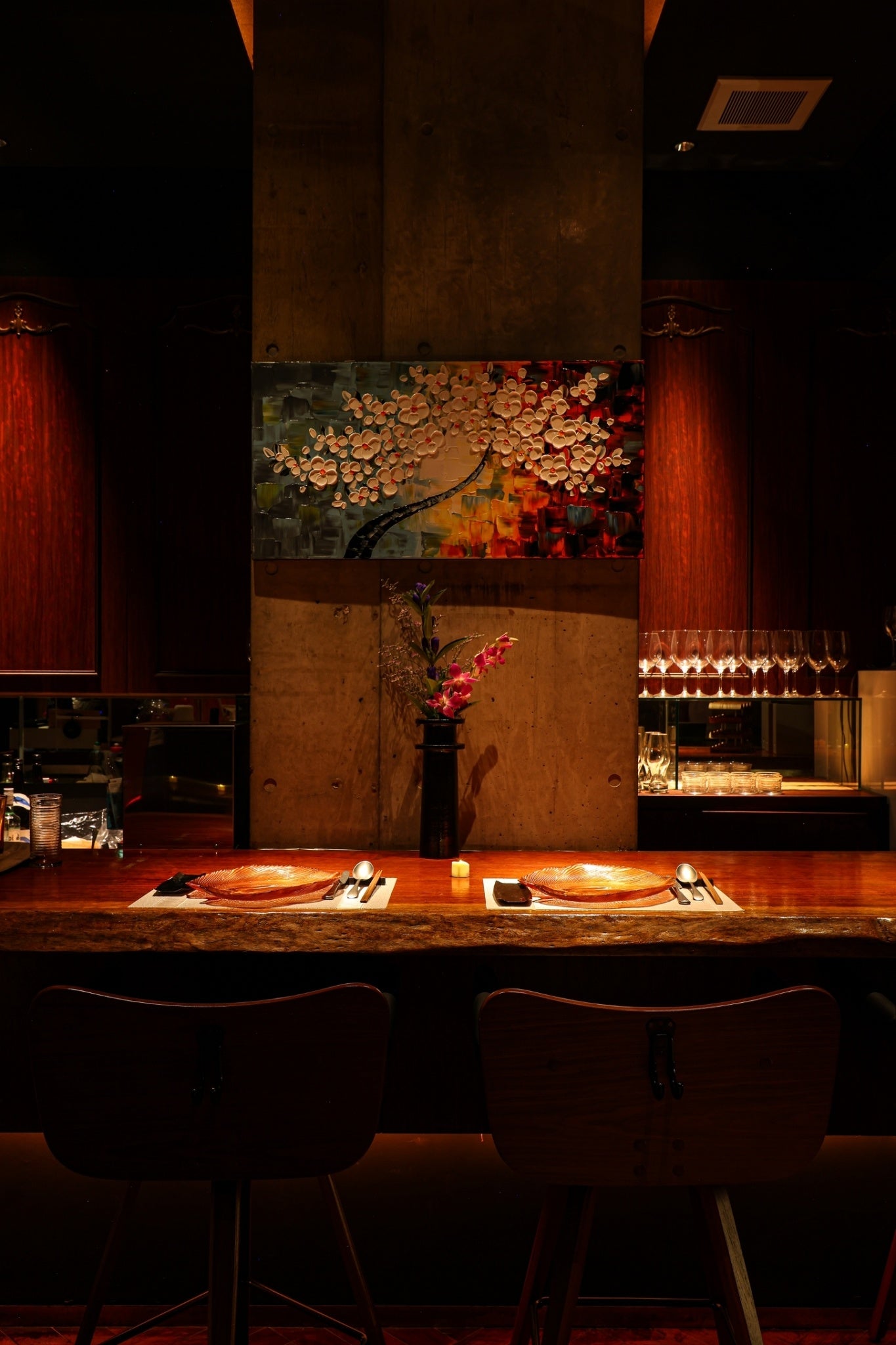 一枚板のバーカウンターから出されるドリンクは日本各地の生産者から送られる厳選された食材を使用した国産ワインや国産クラフトビール。ノンアルコールドリンクも国産にこだわり、すべてお勧めできるように納得のいくまで選出したドリンクはお客様の大切な時間を彩ります。