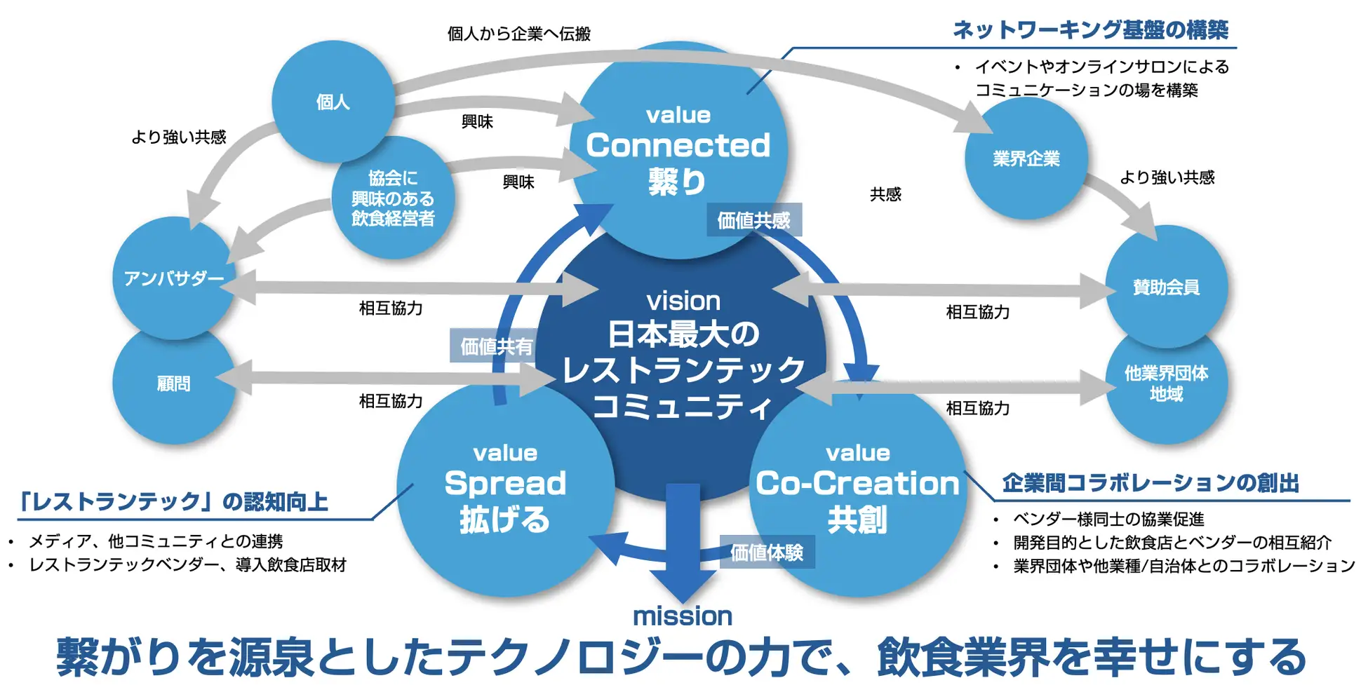 「テクノロジーの力で、飲食業界を幸せにする」をミッションに、テクノロジー企業を中心とした賛助会員の皆様をはじめ、業界企業や団体の皆様と共に、数多くのイベントやコミュニティ運営を通じて、飲食DXの普及活動を行なっております。