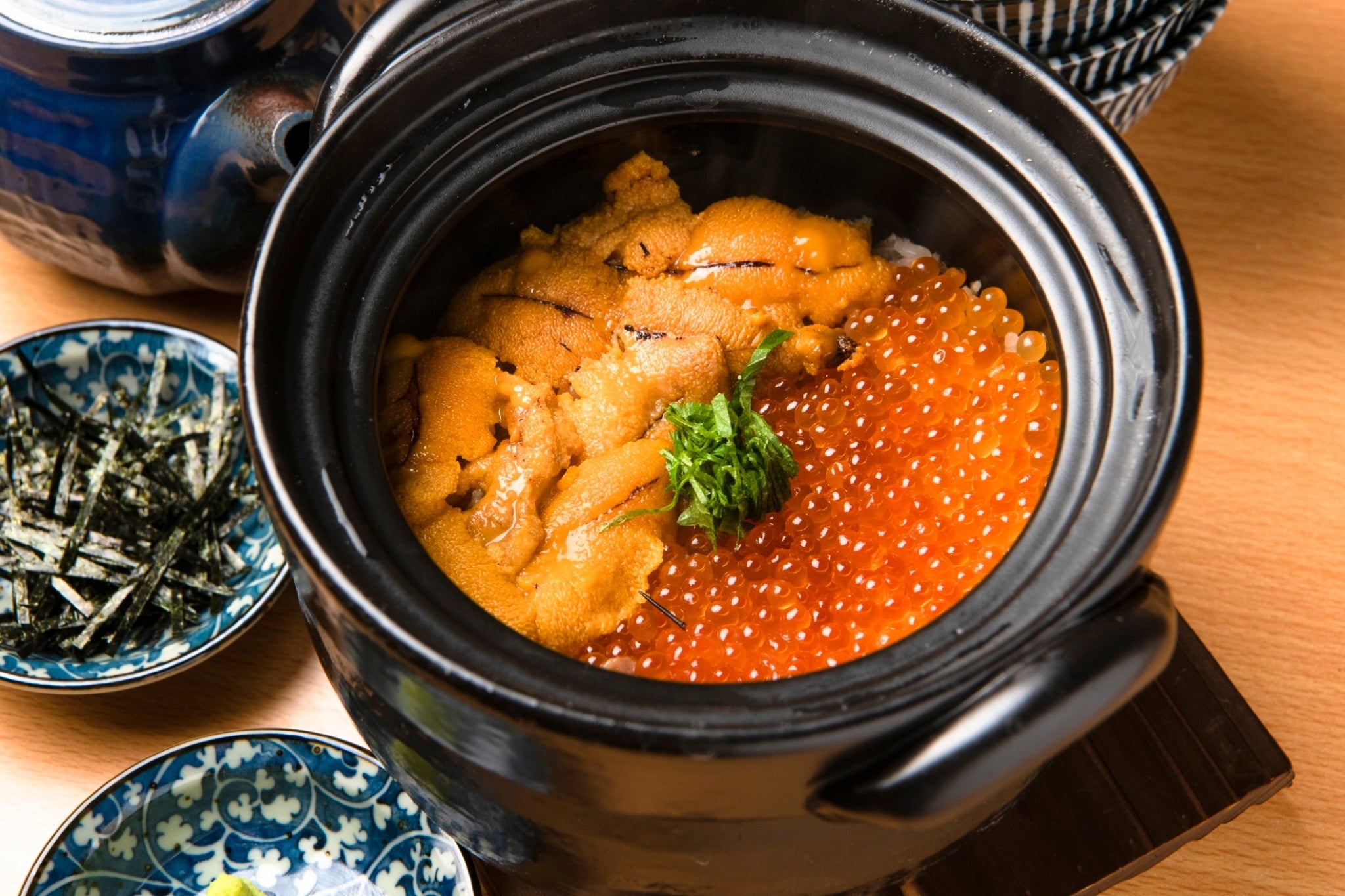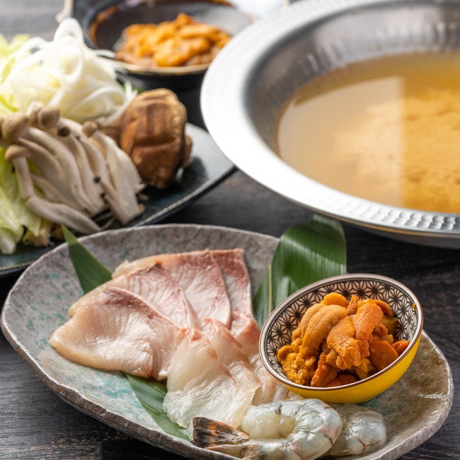 雲丹を贅沢に酒とみりんで伸ばし、ブレンドした味噌で仕上げた出汁で、雲丹の香りを存分に楽しみながら海老やブリなどの海鮮しゃぶしゃぶをご堪能いただけます。雲丹は厳選した生雲丹を、その日良いものを仕入れています。